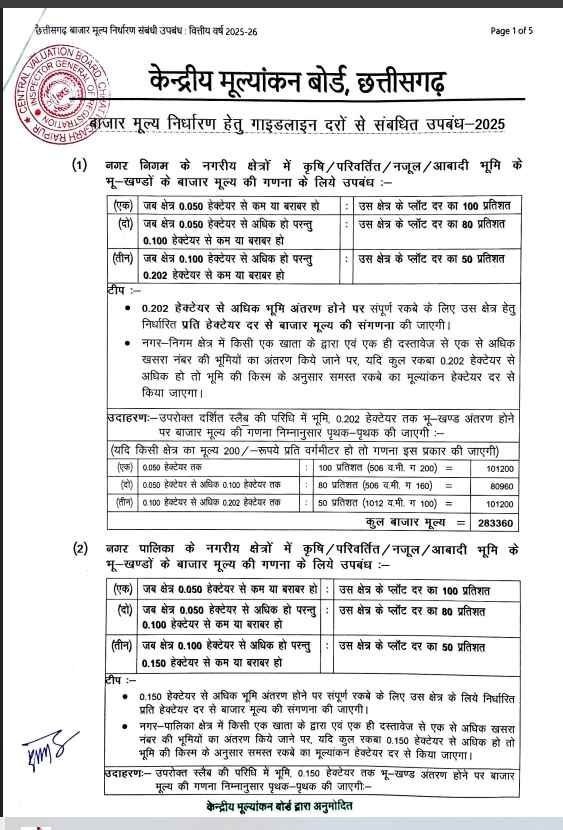 रायपुर : छत्तीसगढ़ सरकार ने जमीन की नई गाइडलाइन दर जारी की है। 20 नवंबर से राज्य में लागू नई गाइडलाइन दरों के संबंध में विभिन्न हितधारकों से सुझाव, ज्ञापन एवं प्रस्ताव प्राप्त हुए थे। इन पर विचार करने के लिए मुख्यमंत्री विष्णुदेव साय एवं वित्त मंत्री ओपी चौधरी के निर्देश पर केन्द्रीय मूल्यांकन बोर्ड की बैठक हुई, जिसमें कई महत्वपूर्ण निर्णय लिए गए। गाइडलाइन में बड़े बदलाव किए गए हैं। सेंट्रल वैल्यूएशन बोर्ड की मीटिंग के बाद इंस्पेक्टर जनरल ऑफ रजिस्ट्रेशन और सुपरिटेंडेंट ऑफ स्टैंप्स छत्तीसगढ़ ने नई रिवाइज्ड गाइडलाइन जारी की है। वहीं डिस्ट्रिक्ट वैल्यूएशन कमेटियों को 31 दिसंबर 2025 तक नए प्रपोजल सबमिट करने के निर्देश भी दिए गए हैं।