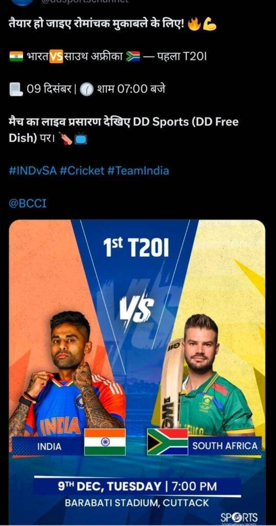 डीडी स्पोर्ट्स पर ऐसे फ्री में देख सकते हैं भारत बनाम साउथ अफ्रीका पहला टी20 इंटरनेशनल मैच