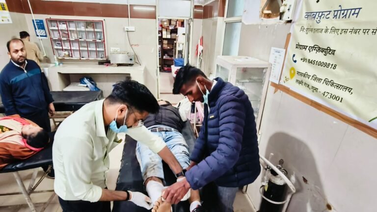 गुना। कुशमोदा इलाके में बुधवार सुबह एक दर्दनाक हादसा उस समय हुआ जब एक हत्यारे तेज रफ्तार ट्रक ने तीन बाइकों को ओवरटेक करते समय टक्कर मार दी। इस हादसे में चार लोग घायल हो गए, वहीं एक युवक की मौके पर ही मौत हो गई। हादसे के बाद ट्रक चालक फरार हो गया। घटना के बाद इलाके में हडक़ंप मच गया। इस घटनाक्रम से पुलिस की सुरक्षा व्यवस्था और यातयात प्रभारी की कार्यप्रणाली पर सवाल खड़े हो रहे हैं। चुकी एक ओर पुलिस रोजाना चालानी कार्यवाही में मस्त है तो वहीं दूसरी ओर शहर में हर रोज हो रहे हादसों की ओर गंभीर नहीं है उन्हें अनदेखा किया जा रहा है।